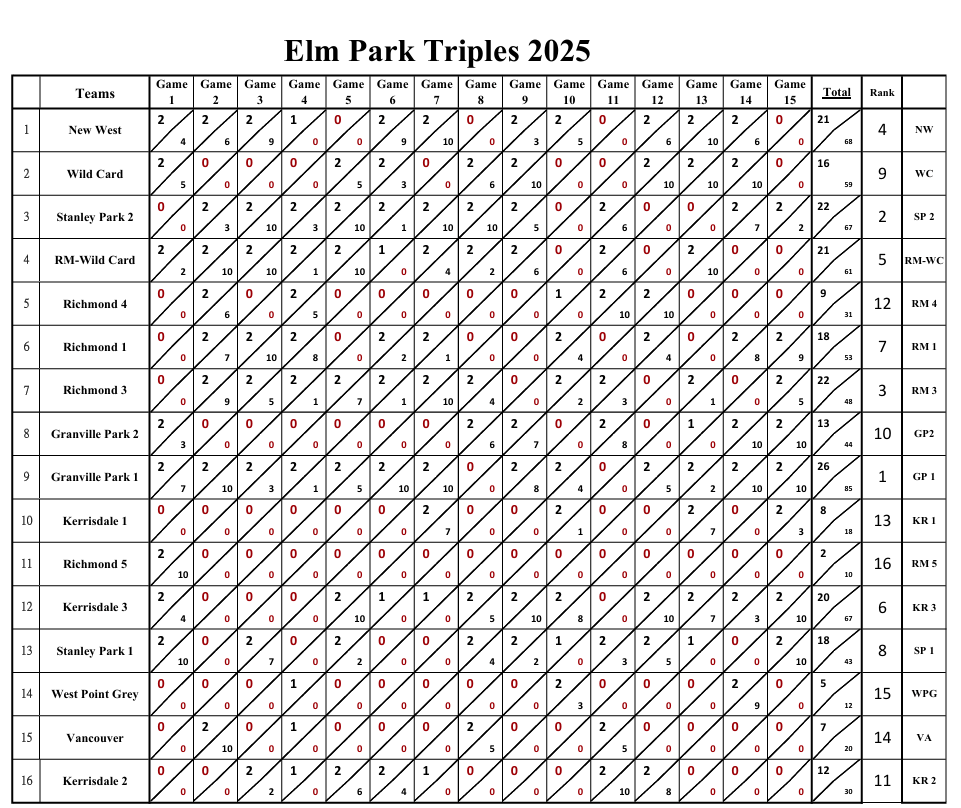 Here are the final results of the 2025 season with a congratulations to Granville Park. Thanks one and all for participating and a big thank to volunteers!